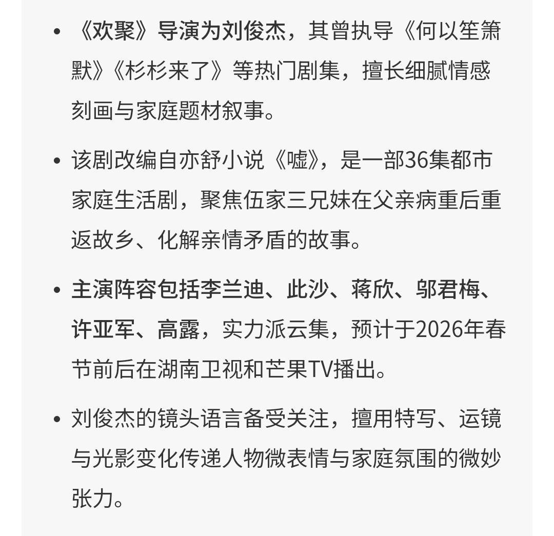 不同于隧说念聚焦家庭战斗的剧集,《欢聚》以 “欢聚” 二字为中枢落点,传递诊疗东说念主心的力量。正如亦舒原著中所言:“但凡与好友一齐喝的,即是好酒,吃得慷慨,即是佳肴,一家东说念主共聚一堂,即是好屋。” 剧中虽充满矛盾与博弈,但最终将走向合家欢结局,在化解纷争的经由中,展现中国式家庭的良善与包容,让不雅众在感受剧情张力的同期,也能体会到亲情的特别与诊疗。